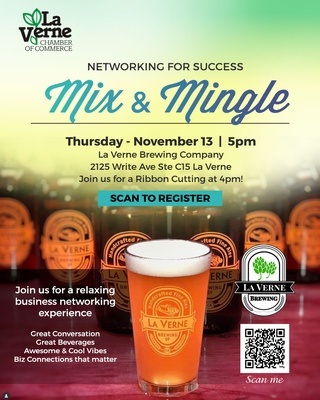 Mix & Mingle with La Verne Chamber of Commerce. Relax, unwind, and connect at our Multi-Chamber Mix & Mingle event, held on the 2nd Thursday of every month! This program is designed for hard-working professionals to enjoy a casual, fun environment while building meaningful relationships and strategic partnerships.